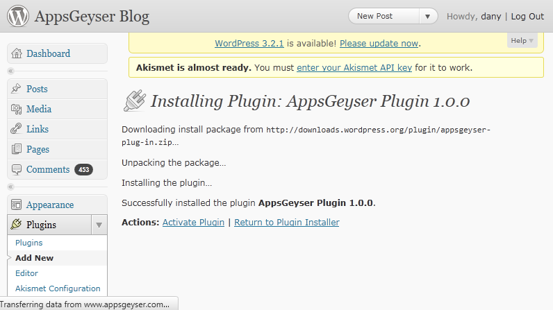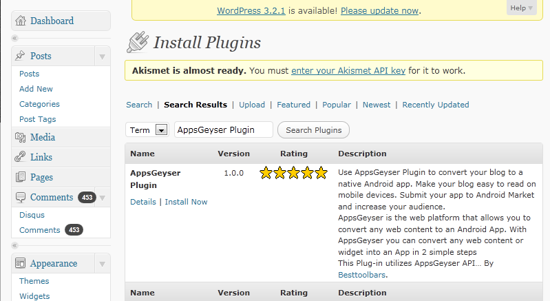 You’ll also need to have one of these plugins installed: WordPress Mobile Pack or Carrington Mobile Theme. If neither of these is installed, follow the instructions below for installing a plugin before you install the AppsGeyser plugin to install one of these.