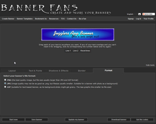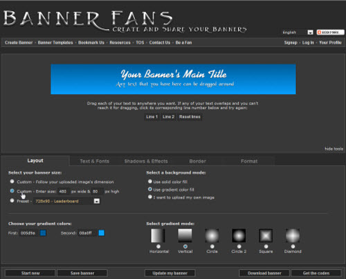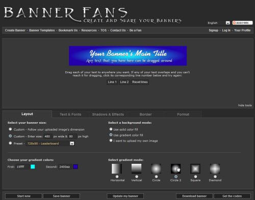 - Layout: Custom! Enter Size: 480px wide by 80px high. (Note: To see banner changes, you have to click ‘Update my banner.’)