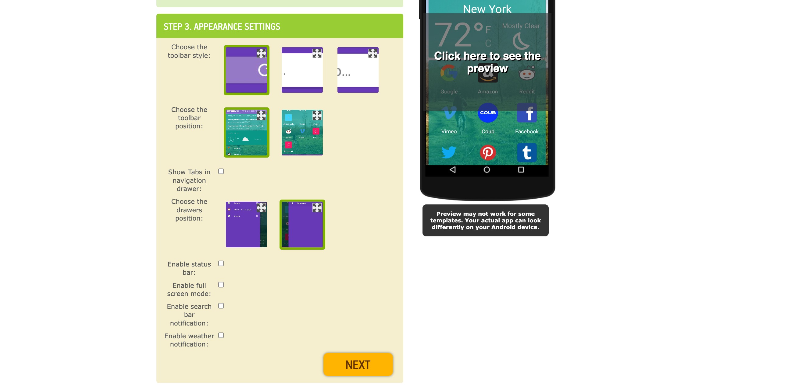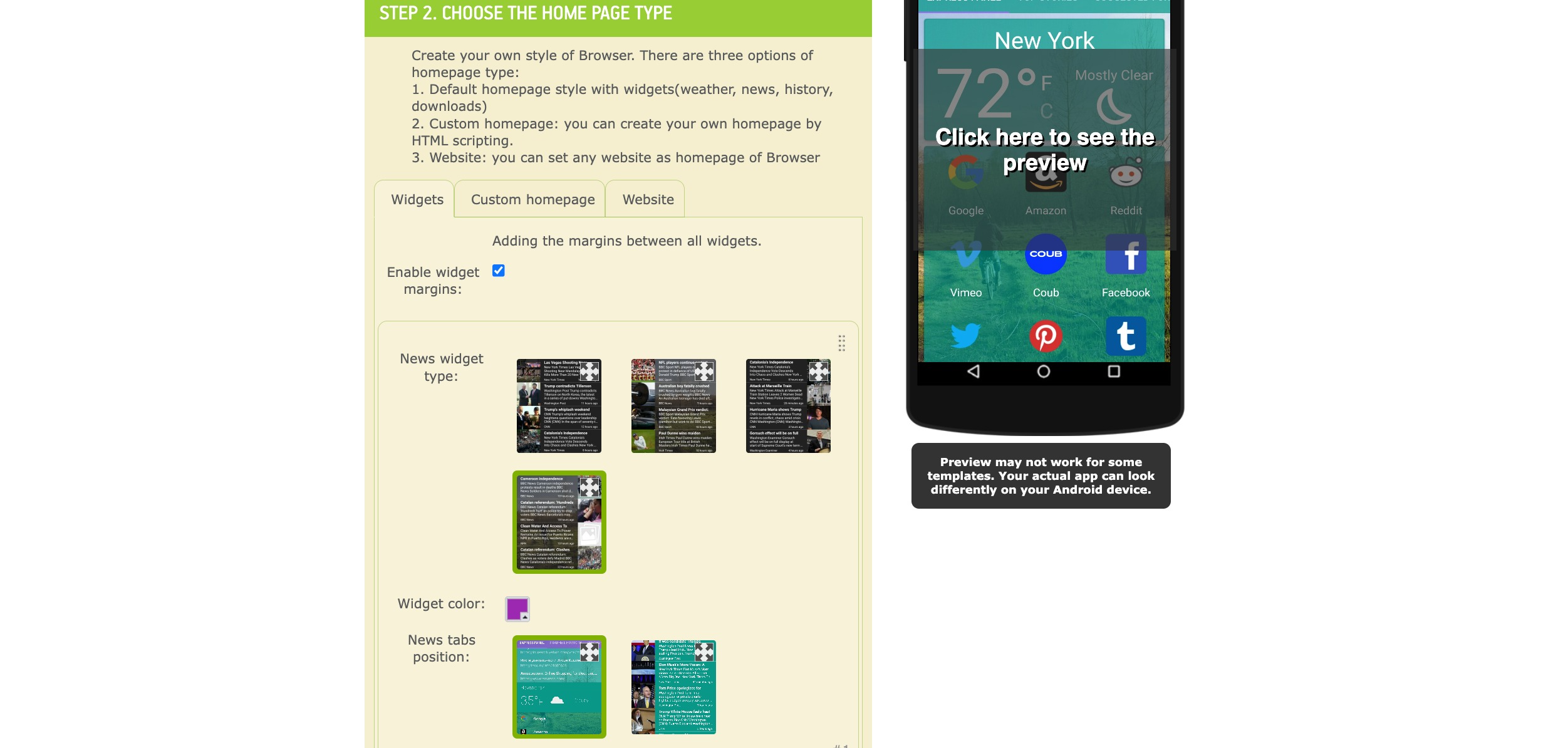 Step 3 is where you choose the ideal homepage for your browser. This way, you can create your own browser style. The Appsgeyser browser creator gives you three different homepage style options. You get the default homepage style with the following widgets; weather, news, history, and downloads, then you have a custom homepage style option that allows you to add your own HTML script. The third option allows you to set your own website homepage as the homepage of your browser. This can also be a great way to market your business!