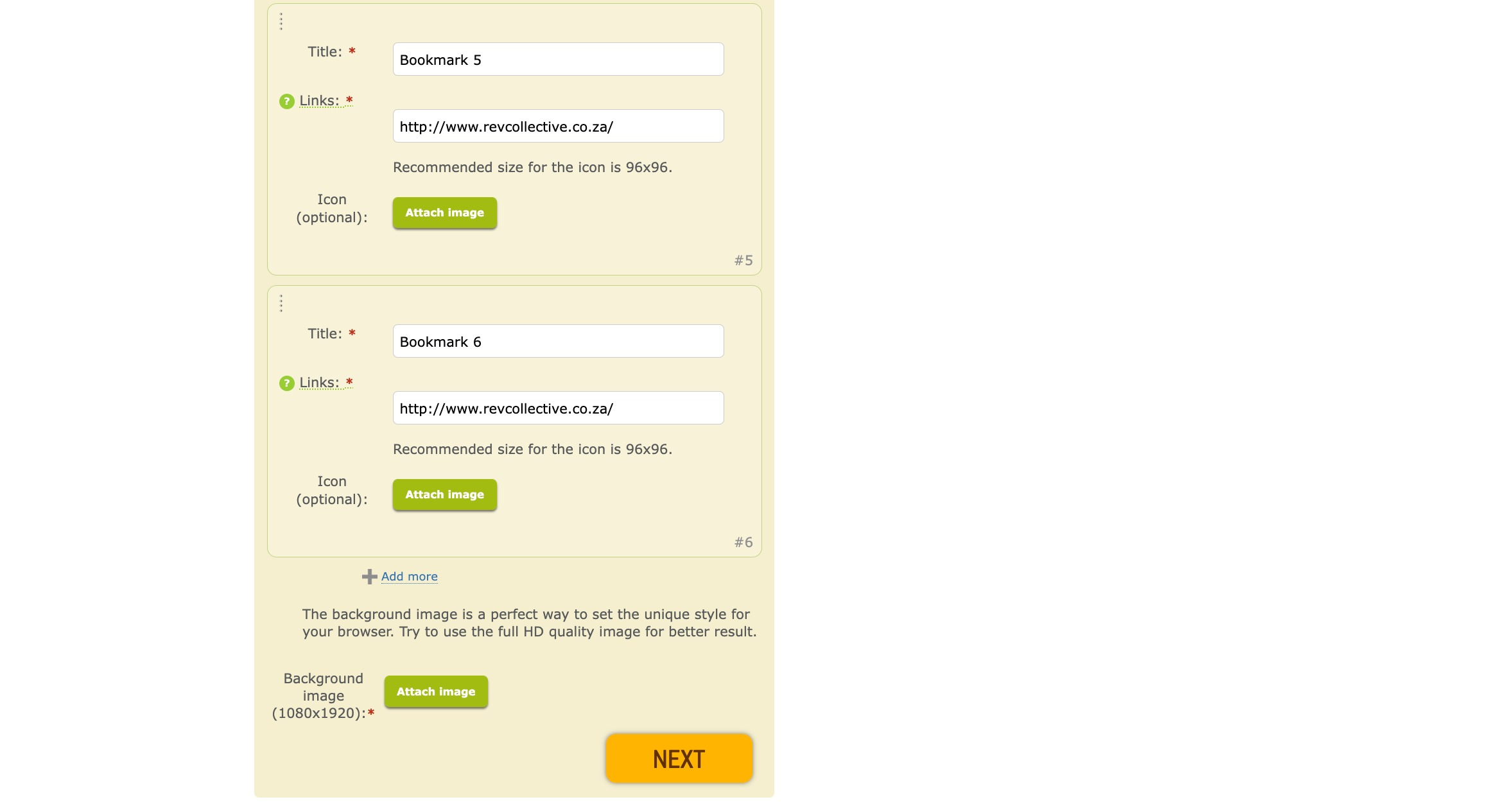 After you have added your 6 bookmark links, you can add a background image to make your browser unique. The background image option is not optional, you must upload at least one background image to your browser. For better image quality, and better appearance, always try to use an HD quality image.