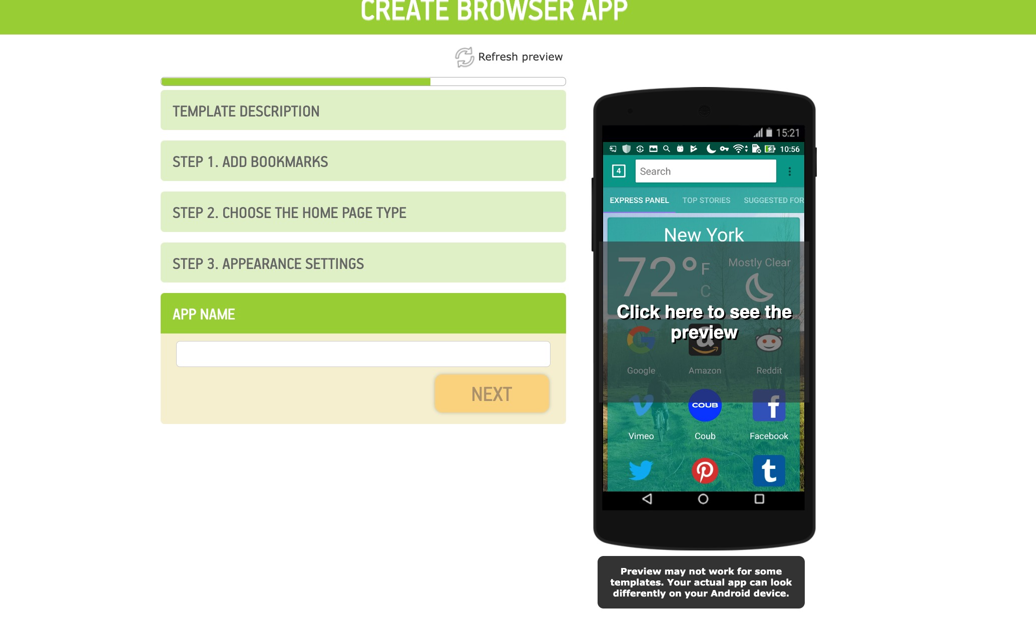 The first step in your browser creation process will be to add your bookmarks. With the Appsgeyser browser creator, you need to add at least 6 links as you can see above. In order for you to move on to the next step, you must have added at least 6 bookmarks to the browser.