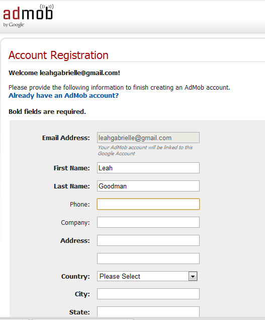 4: This will take you to the AdMob main page – either complete your login details or create a new account if you have yet to register