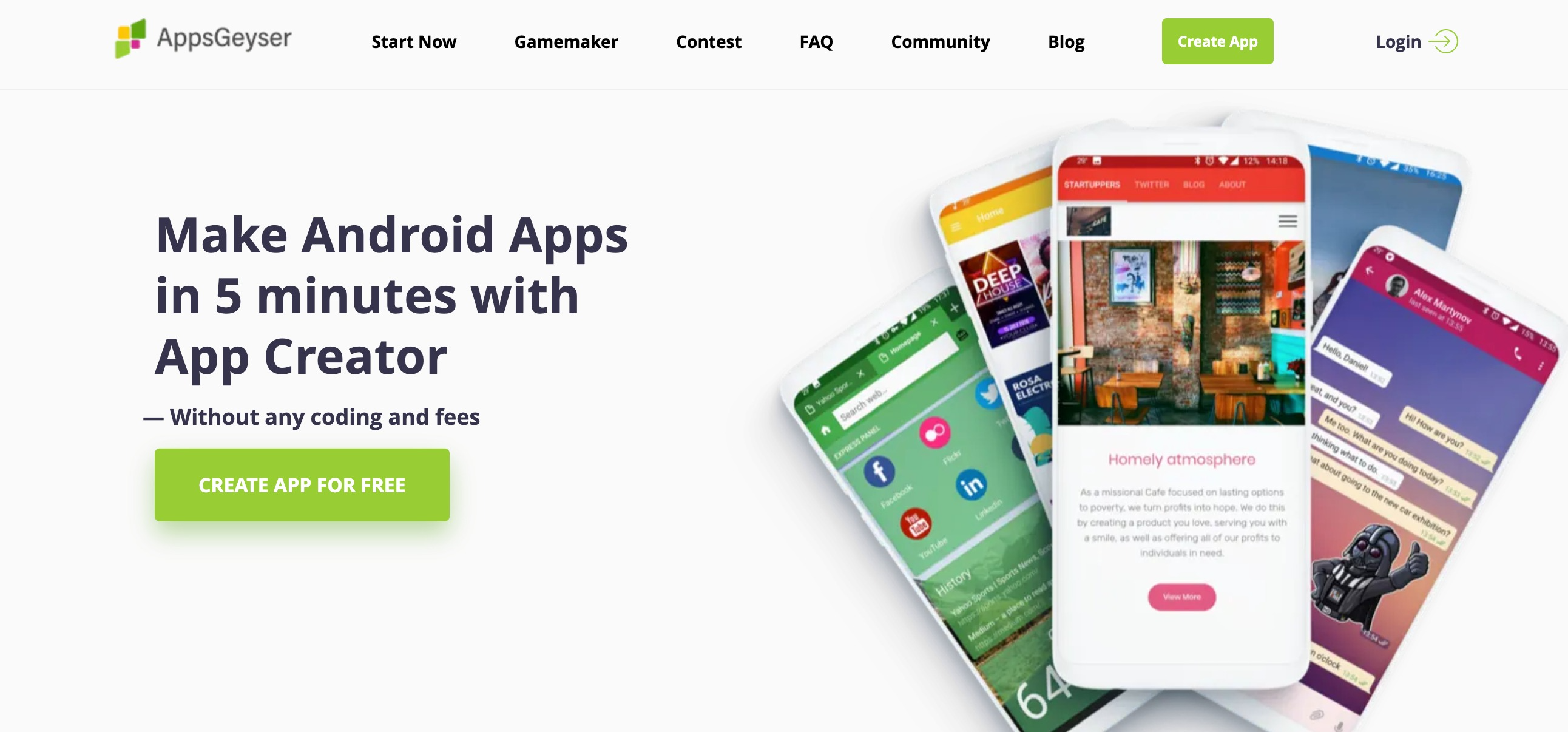 To create a free Android App with Appsgeyser, you can start by opening AppsGeyser.com – free App Builder. On the platform, you can create Android apps without any coding knowledge or extra costs. AppsGeyser offers over 30 app templates that include website templates, blog templates, Facebook templates, messenger templates, book reader templates, and more.