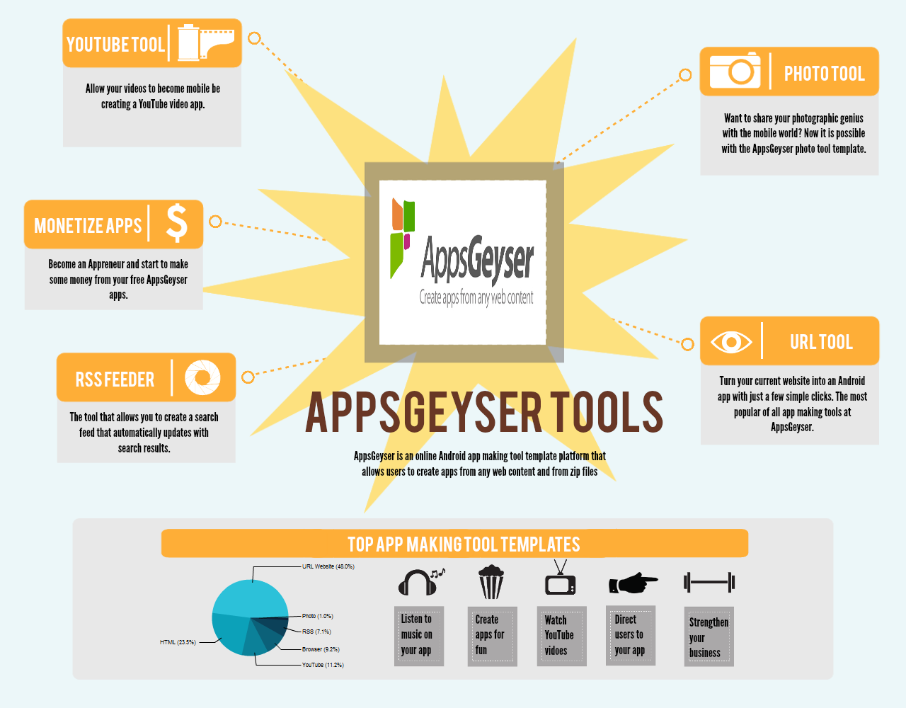 Appsgeyser – это онлайн платформа для создания приложений, которая помогает любому пользователю создать Андроид приложение с нуля. Цель компании Appsgeyser – позволить людям как без технического опыта, так и с ним, создавать бесплатные Андроид приложения с помощью шаблонов Appsgeyser.